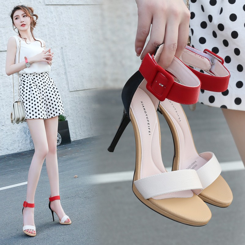 高跟鞋防水台细跟凉鞋女2019夏季新款网红性感拼色一字扣百搭女鞋